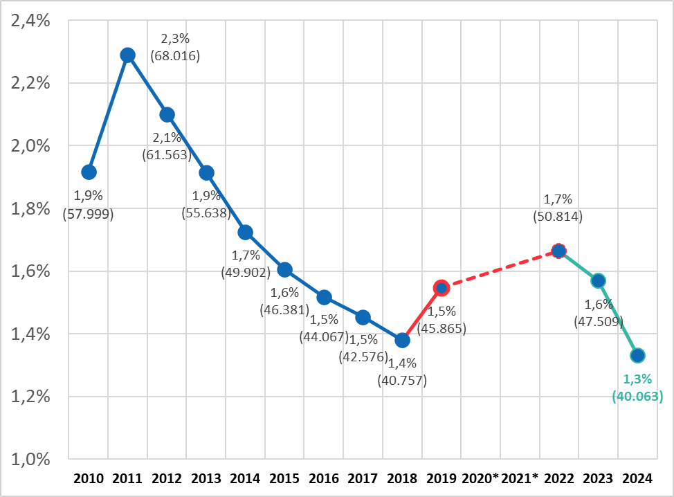 Con esta reducción, el 2024 registra la cifra más baja desde que existe información comparable (2010), ubicándose incluso por debajo del 1,4% alcanzado en 2018 (40.575 estudiantes), que hasta ahora constituía el mínimo histórico.
